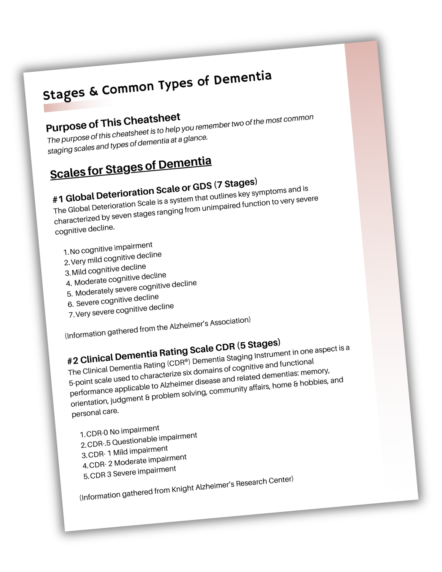 Lifetime access to the Stages & Types of Dementia Cheatsheet — a quick-reference guide for identifying stages, understanding types, and knowing what’s next.