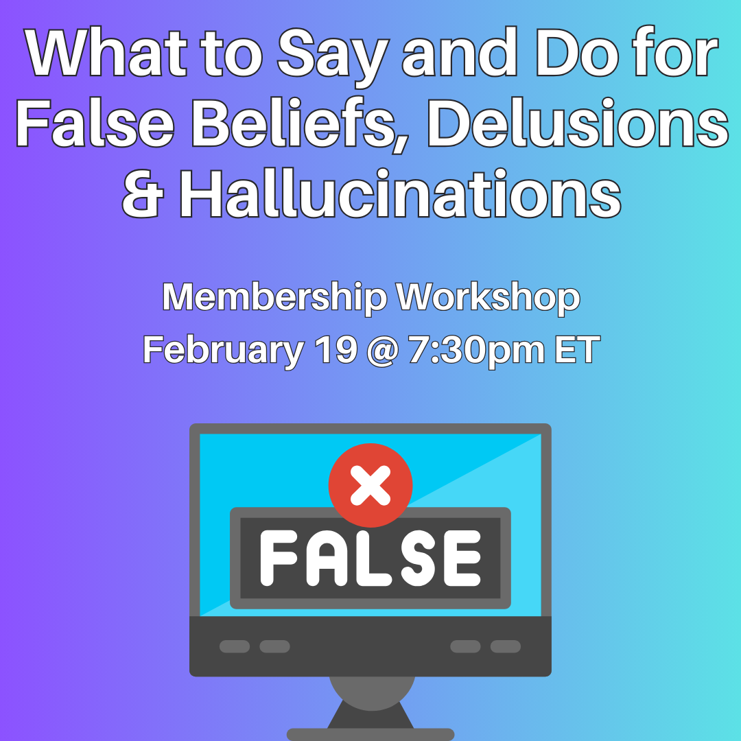 On Thursday, February 19 at 7:30pm ET, we’re hosting a workshop called “What to Say and Do for False Beliefs, Delusions & Hallucinations” to help you stop the arguing spiral and finally feel confident about what to do.